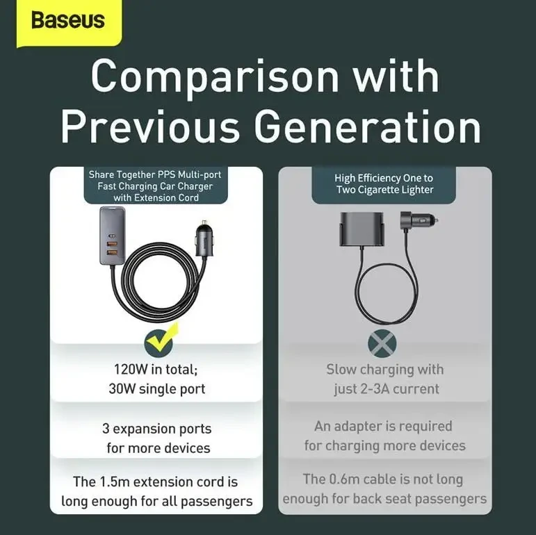 Buy Baseus Share Together 3x USB / USB Type C car charger 120W PPS Quick Charge Power Delivery gray available at ShoppersStop.pk Specification: • Brand: Baseus • Type: Car quick charger • Material: Aluminium + PC • Input: DC 12-24V • USB1, USB2 and USB3 output: 5 V/3 A, 9 V/2 A, 10 V/2 A, 12 V/2,5 A; 30 W • USB type C output: 5 V/3 A, 9 V/2,22 A, 12 V/2,5 A, 15 V/2 A, 20 V/1,5 A; 30 W • Total output: 4 x 30 W • Cable length: 1,5 m • Plug diameter: 22,3 mm. • Plug length: 39 mm. • Width of panel with sockets: 31,5 mm • Length of panel with sockets: 72 mm Content of the set: • 1 x Car quick charger Major features: • Elegant design and finish • Long cable • Large number of available ports • Support to quick charging • Possible to connect to four devices at a time. • Protection against overheating • Protection against overcharging Buy Baseus Share Together 3x USB / USB Type C car charger 120W PPS Quick Charge Power Delivery gray available at ShoppersStop.pk Specification: • Brand: Baseus • Type: Car quick charger • Material: Aluminium + PC • Input: DC 12-24V • USB1, USB2 and USB3 output: 5 V/3 A, 9 V/2 A, 10 V/2 A, 12 V/2,5 A; 30 W • USB type C output: 5 V/3 A, 9 V/2,22 A, 12 V/2,5 A, 15 V/2 A, 20 V/1,5 A; 30 W • Total output: 4 x 30 W • Cable length: 1,5 m • Plug diameter: 22,3 mm. • Plug length: 39 mm. • Width of panel with sockets: 31,5 mm • Length of panel with sockets: 72 mm Content of the set: • 1 x Car quick charger Major features: • Elegant design and finish • Long cable • Large number of available ports • Support to quick charging • Possible to connect to four devices at a time. • Protection against overheating • Protection against overcharging